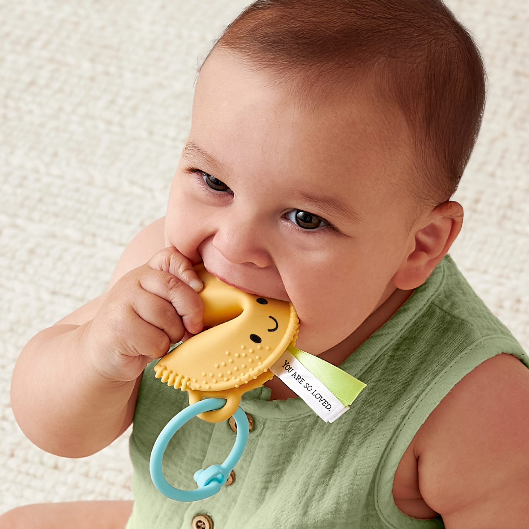 Good Fortune Awaits! Bring good fortune to baby`s teething phase with the Itzy Treat teether. This clever little cookie is made of soft silicone and features soothing textures to massage sore gums from every angle. We predict the sensory ribbons and the positive messages will delight your little sweetie!