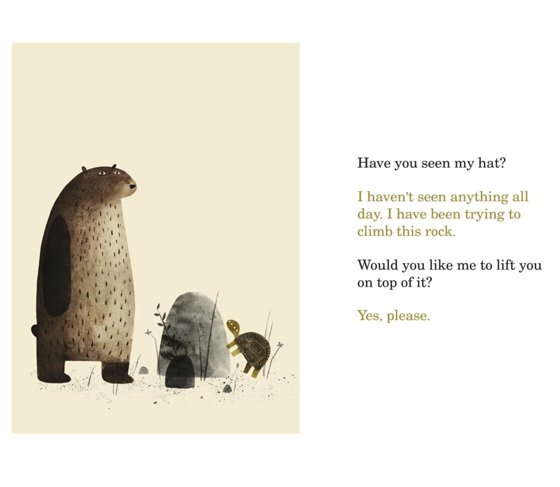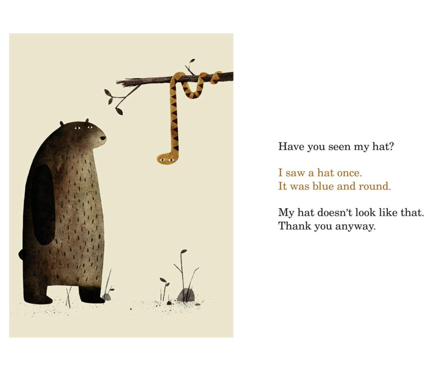 The bear’s hat is gone, and he wants it back. Patiently and politely, he asks the animals he comes across, one by one, whether they have seen it. Each animal says no, some more elaborately than others. But just as the bear begins to despond, a deer comes by and asks a simple question that sparks the bear’s memory and renews his search with a vengeance. Told completely in dialogue, this delicious take on the classic repetitive tale plays out in sly illustrations laced with visual humor — and winks at the reader with a wry irreverence that will have kids of all ages thrilled to be in on the joke.