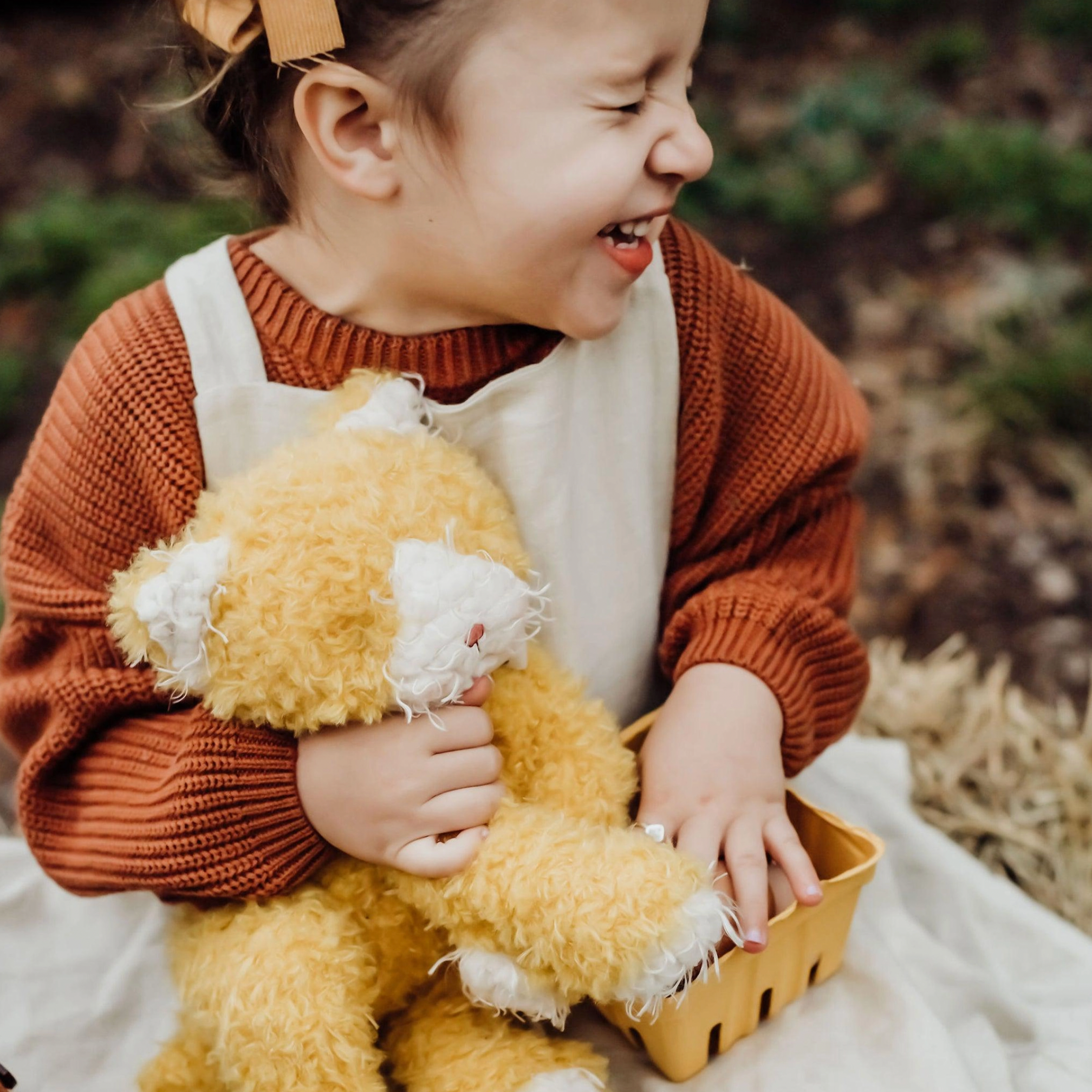 By popular demand, Alley is back on the farm. This adorable kitty cat has mustard yellow scruffy fur with a scraggly cream muzzle we all love. Embroidered face and stylish cream scarf with gray polka dots tied about her neck, make Alley Cat, the cutest little kitten around. Add personalization for an extra special touch.