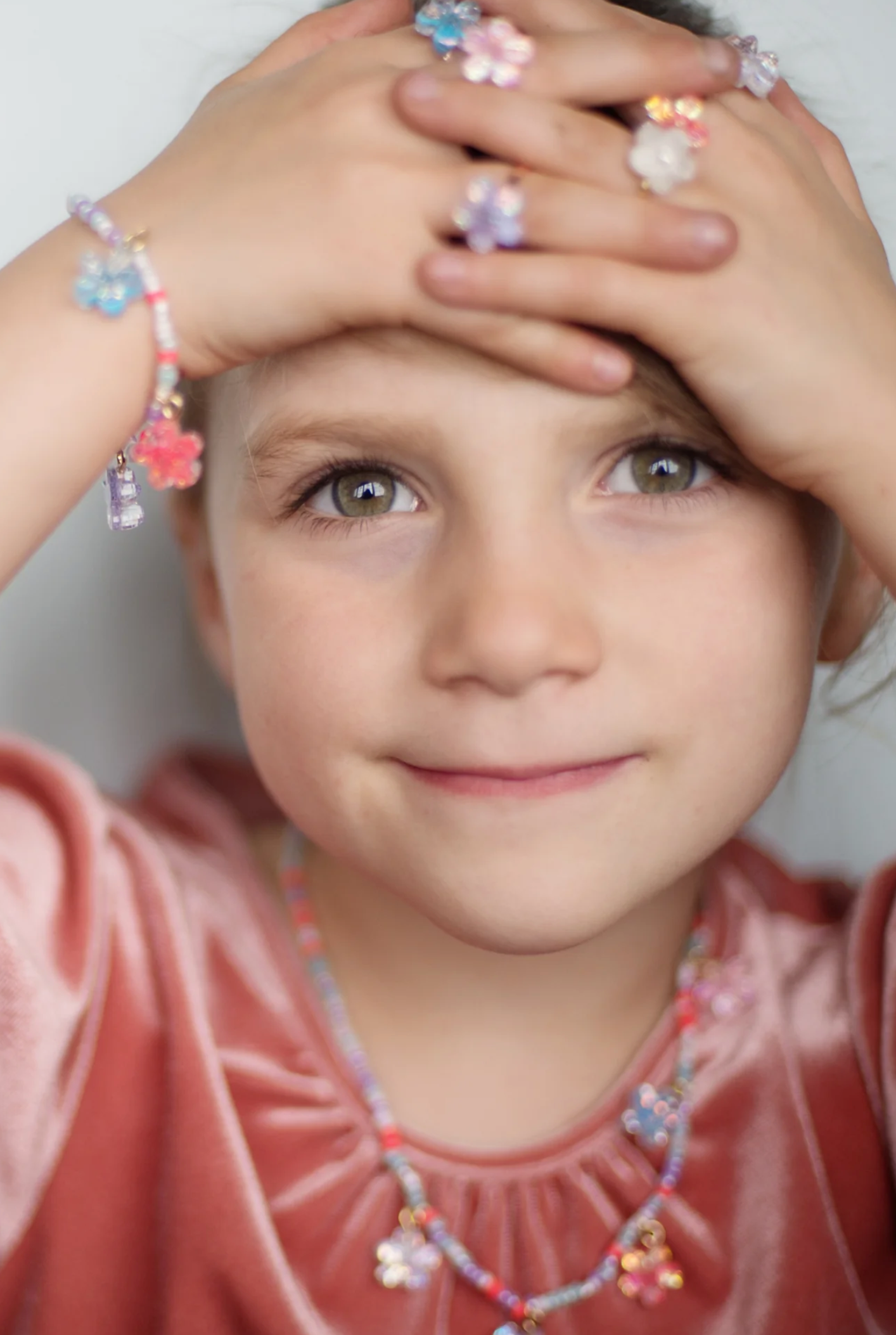 Boutique Shimmer Flower bracelet is a cute, delicate, and stylish accessory for any child This delicate bracelet is made with tiny beads and features 3 flower charms in blue, coral, and purple.