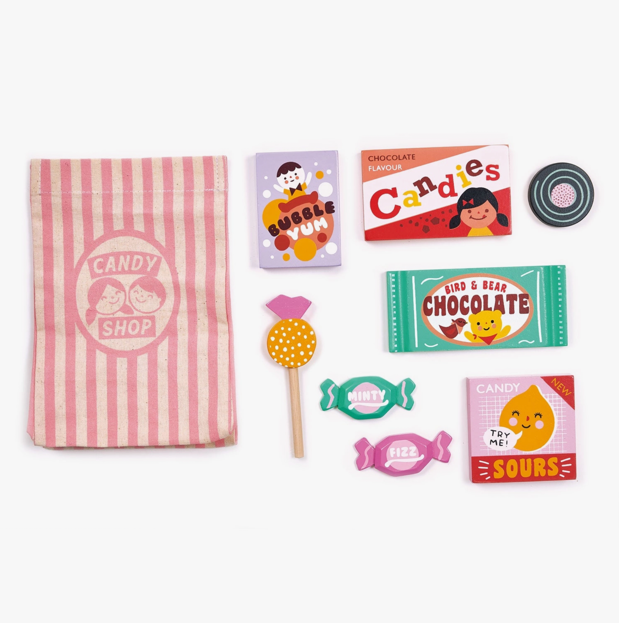 This fabric sweet confectionery bag contains a pretend lolly pop, two small sweets, liquorice wheel, bubble gum pack, chocolate flavoured candies, chocolate bar, and a box of candy sours.