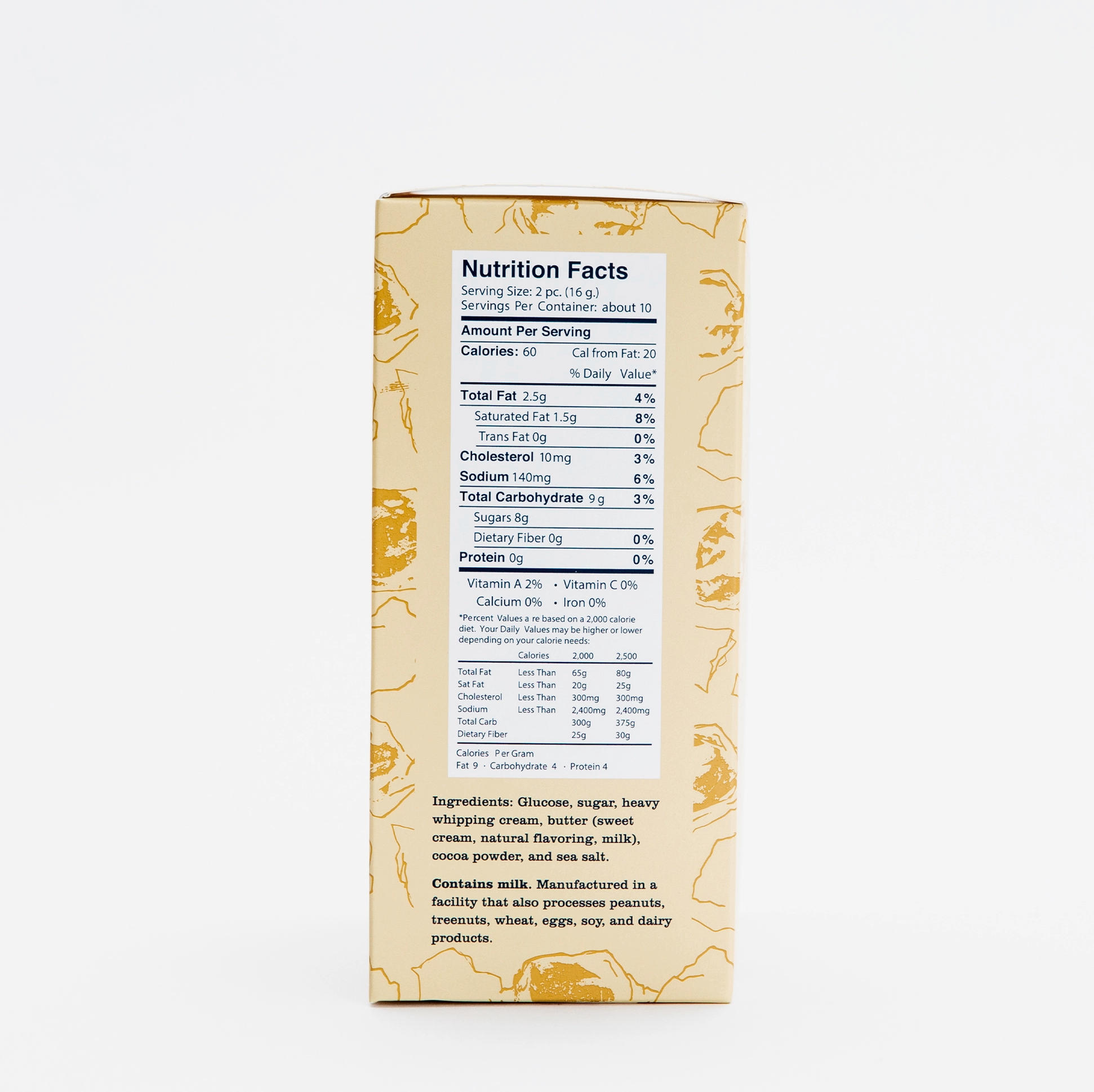 INGREDIENTS: Glucose, Sugar, Heavy Whipping Cream, Butter (Sweet Cream, Natural Flavoring, Milk), Cocoa Powder, Jacobsen Sea Salt.