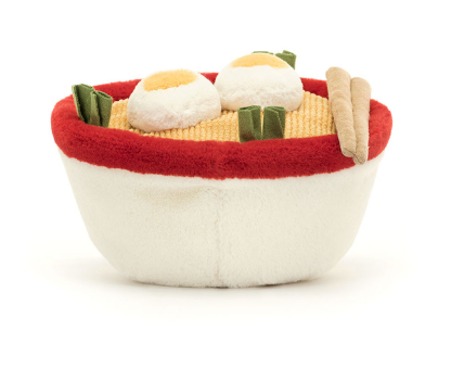 Amuseables Ramen is full of kawaii charm, from the cream-and-red bowl to the suedette chopsticks. Filled with wavy cord noodles, suedette spring onions and fluffy boiled eggs, as well as a pink embroidered fish cake, this dish is a wish come true.