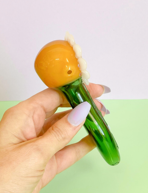 Each of the white petals are individually placed to surround the bowl and the stem is transparent so you can watch the smoke as you inhale