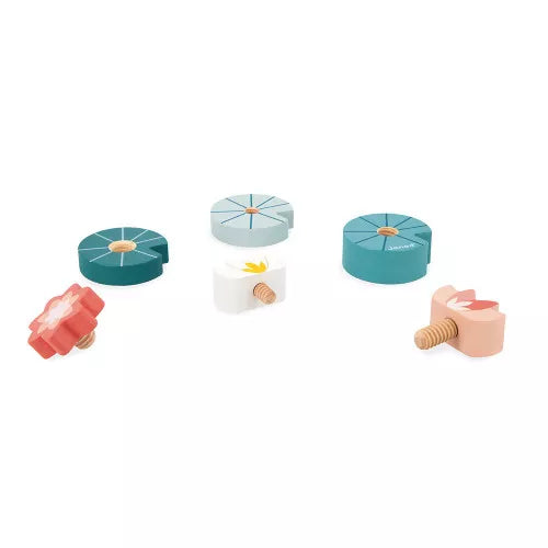 - A screw toy comprising 3 different-shaped and diameter water lilies is also provided for little ones: they’re tasked to attach each flower to their correct leaf!