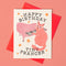 For the Elton John fans comes this delightful kitty crooner singing Happy Birthday at a pink piano among a spray of stars! Risograph printed in light mauve, fluorescent orange, and black.