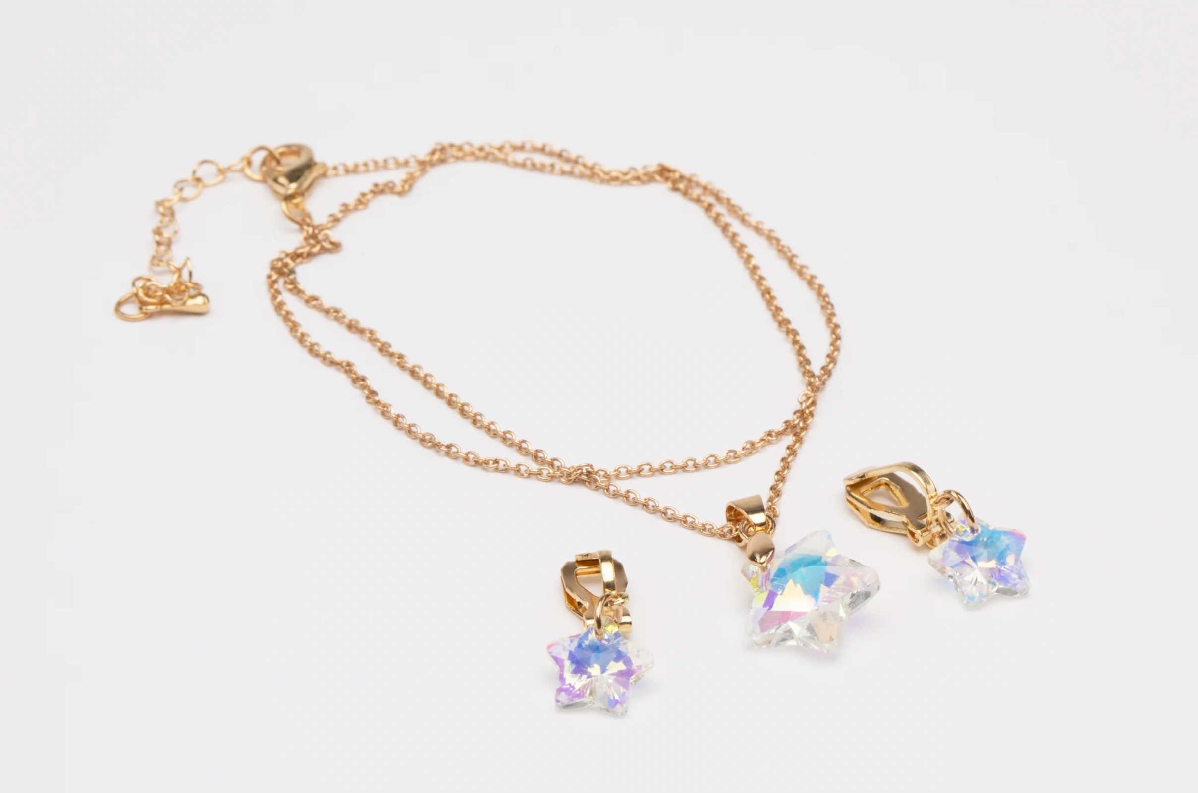 This holographic star necklace comes with matching clip-on earrings and would be the perfect accessory to any outfit!