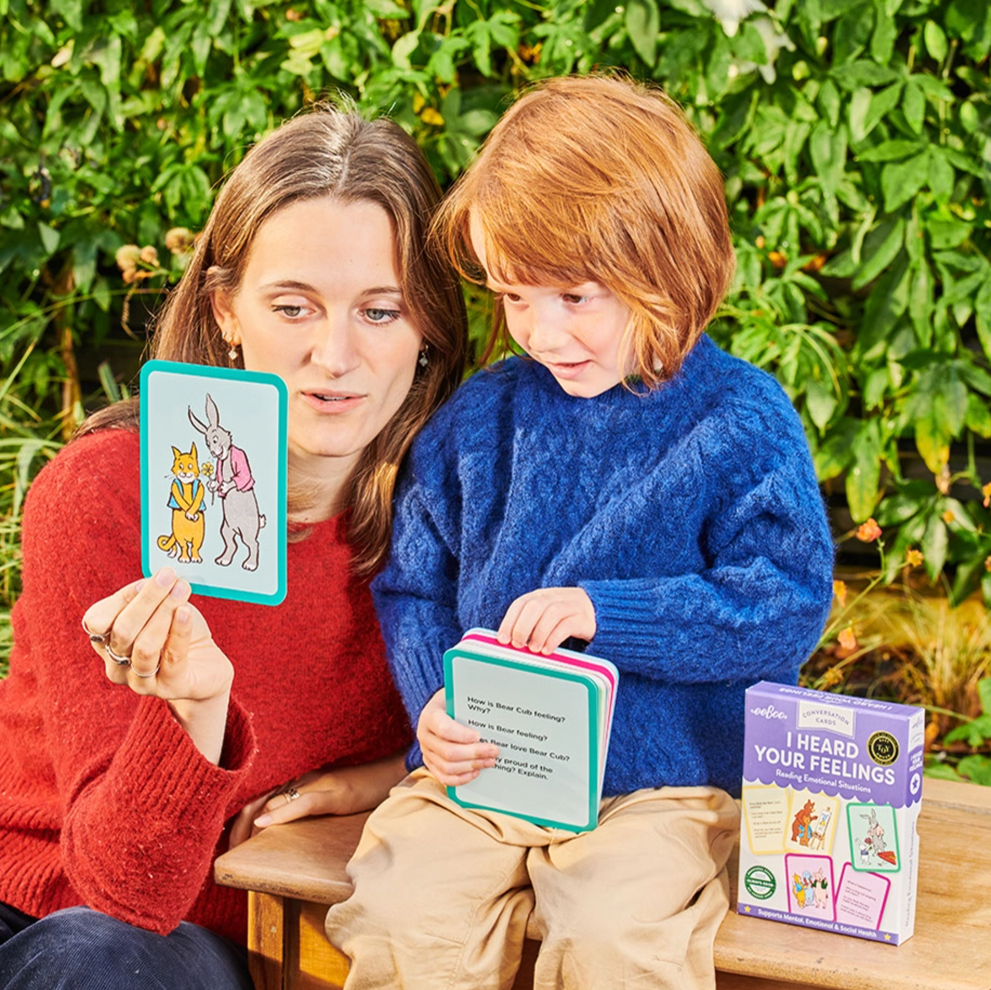 Each Conversation Card features a common scenario, such as being picked for a team, or accidentally breaking a vase. Questions on the back of each card invite parents and children to discuss what is happening and how the characters are feeling in each scene. By looking at the characters’ faces and postures and reflecting on a child's own experiences, these cards help children to recognize emotional dynamics in a variety of situations, while sparking important conversations about feelings and socialization.