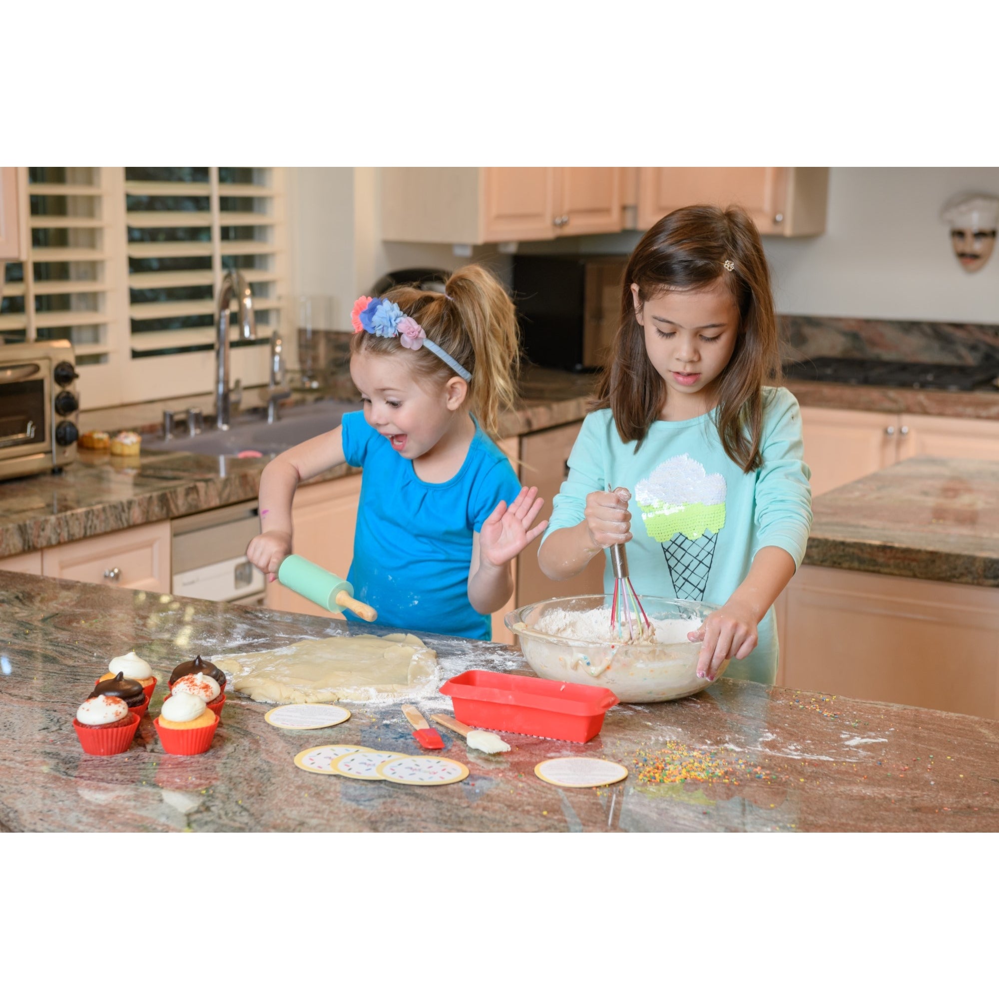 This 17 piece starter baking set has the essential bakeware, utensils and recipes for chefs of all ages to learn to bake cupcakes, muffins, cookies, cakes and more!