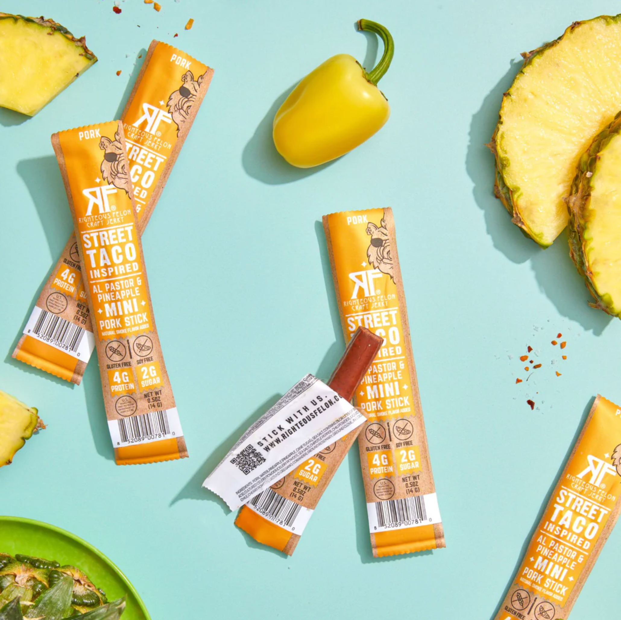 NOW IN MINIS! A 100% pure pork stick tossed in taco seasoning and chili powder, veiled in smoke, and crushed with fresh-cut pineapple. Inspired by devouring Al Pastor tacos by the fistful throughout Mexico City, this meat stick is RF's tribute to the greatest dining metropolis in all Latin America. Hold onto your sombreros and dig into our pork jerky stick.