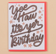 This greeting card features a New York City street scene. The front of the card showcases an illustrated of a row of buildings featuring the familiar street level businesses with apartments and fire escapes on top. Set against a sand colored background, the card reads "Greetings from New York" in white cursive handwriting scrawled across the bottom of one building.