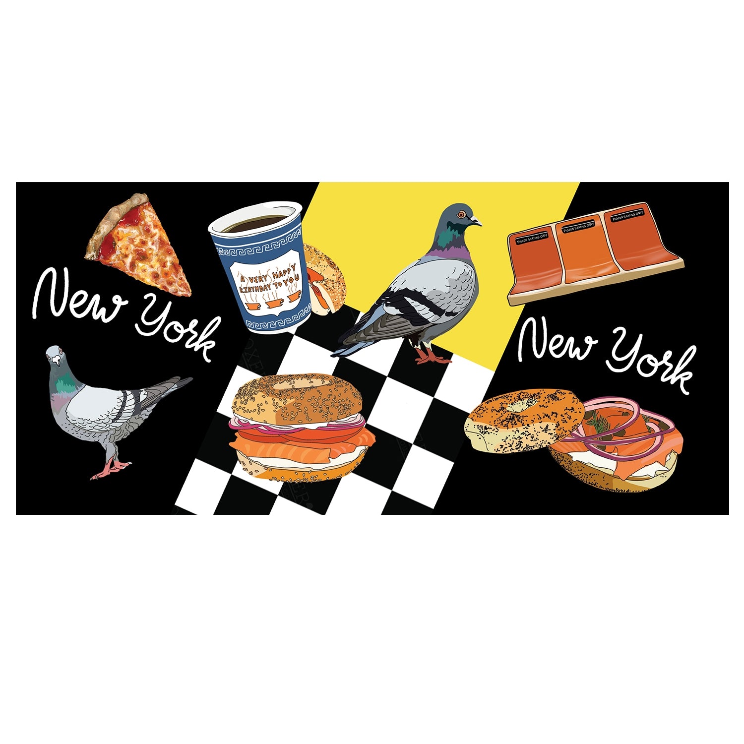 New York Favorites Mug including pigeons, the subway, pizza, bagels, coffee!