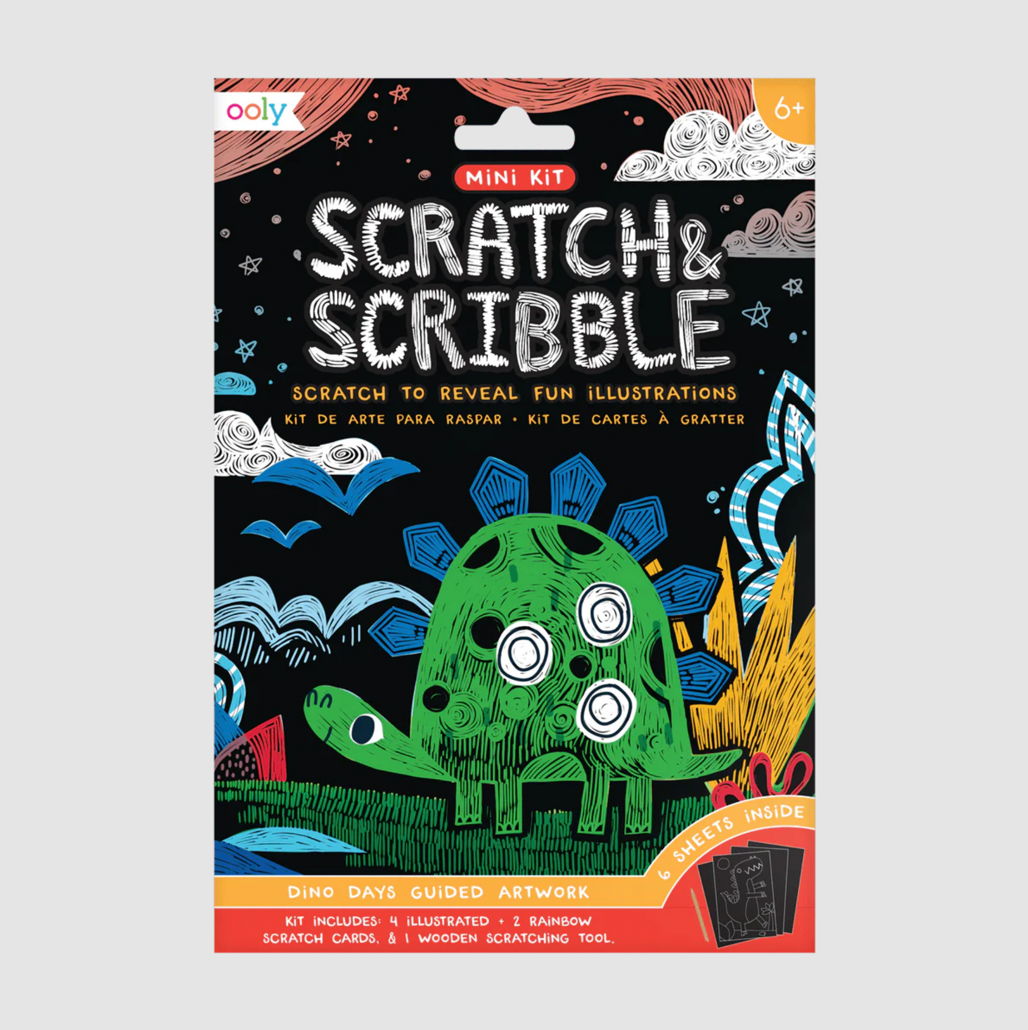Delightful dinosaurs in rainbow hues are hidden until you scratch and scribble to reveal them. Mini but mighty, this kids scratch art kit has everything included for dinosaur fun. This dinosaur themed scratch art kit is perfect for travel sized fun for on-the-go, or at home creativity.