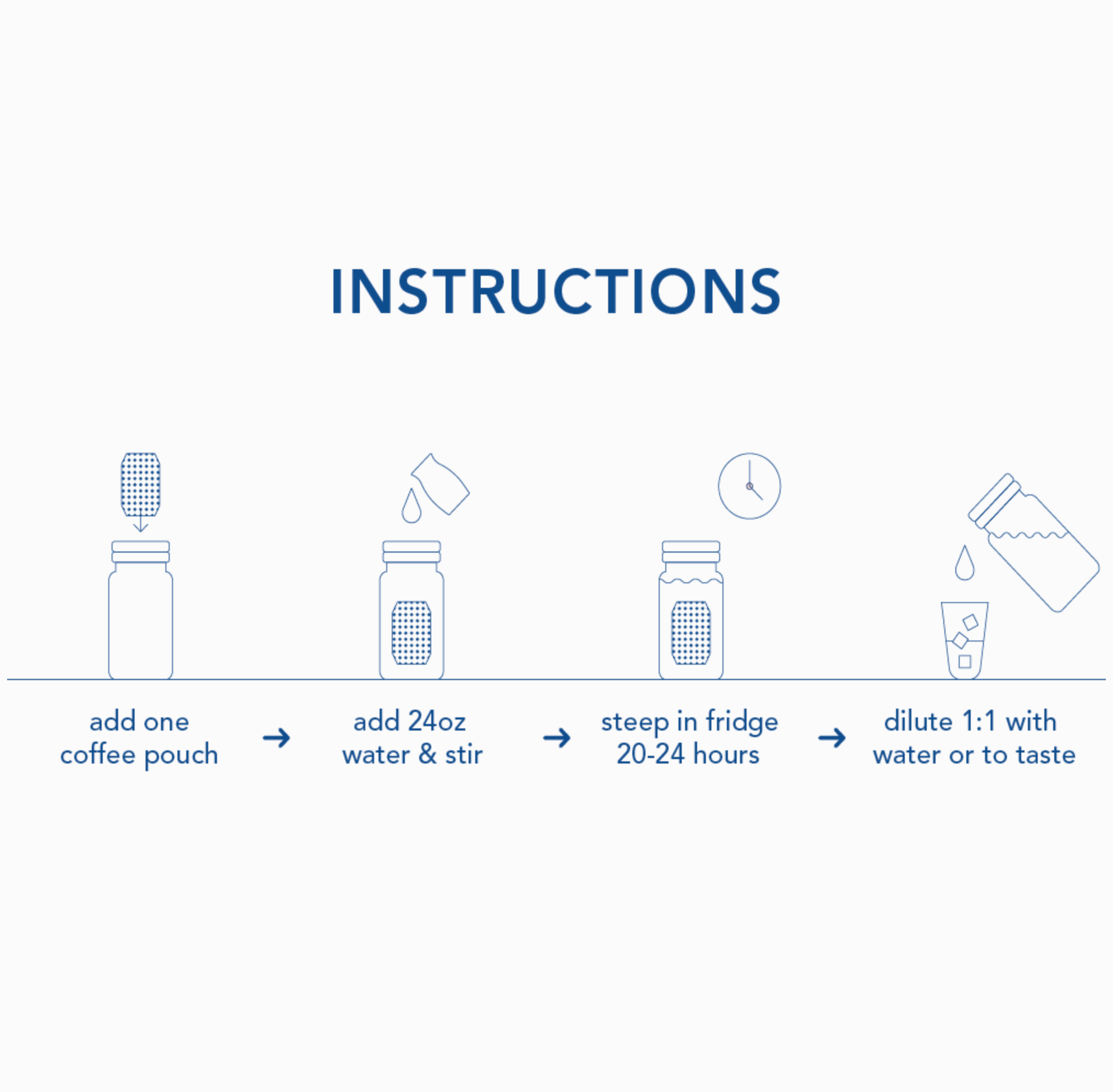 Making cold brew at home just got a lot easier! Each single-use pouch contains 3oz of pre-ground coffee specifically for cold brew. One pouch fits perfectly in your favorite brewing vessel to create a delicious cold brew overnight in your fridge.