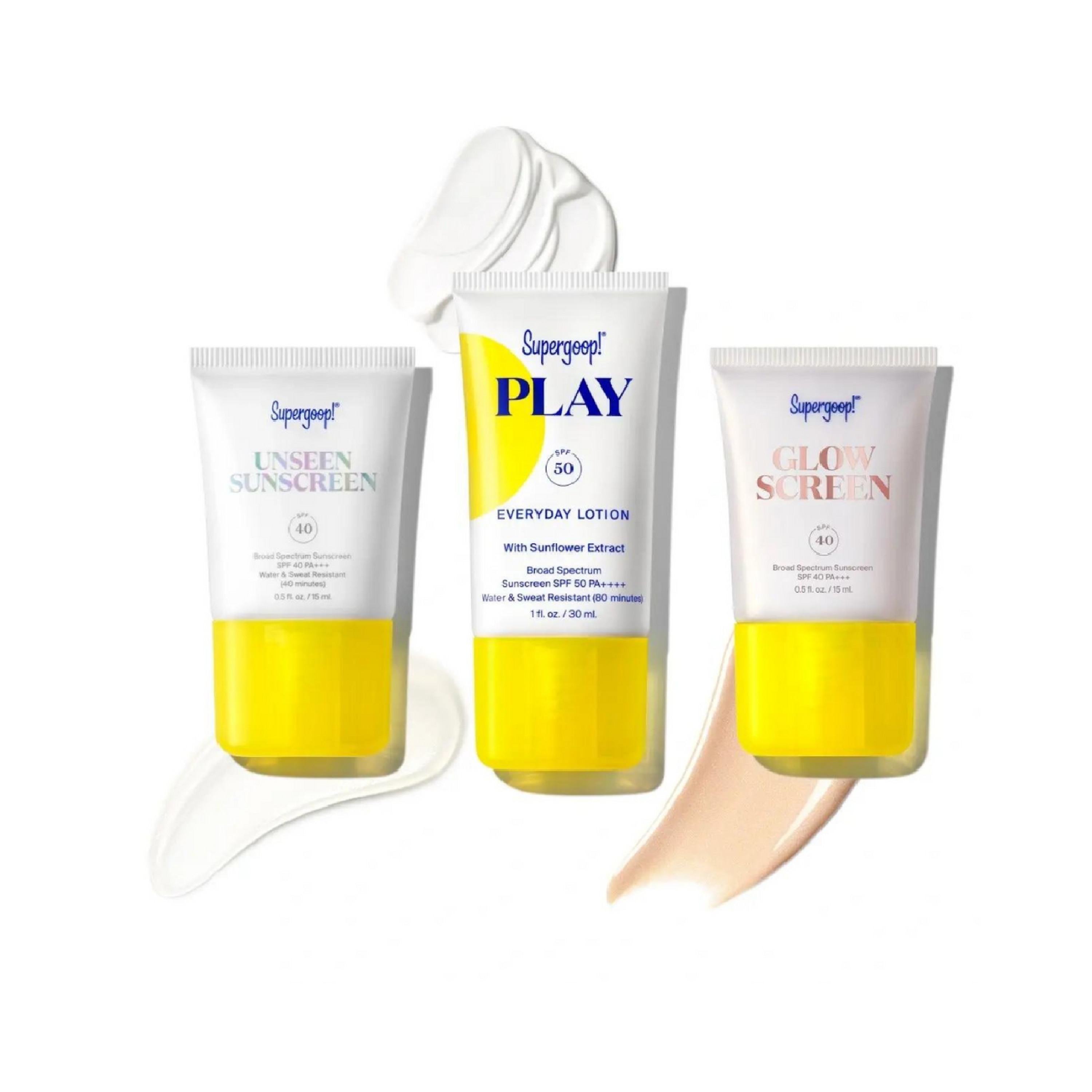Everything you need from Supergoop in a convenient, travel size. What you get: cosmetics bag with a set of three best-selling sunscreens for healthier, happier skin.