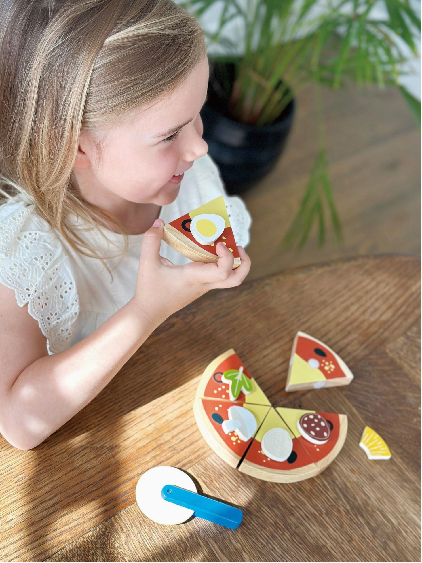 A sliceable 6-portion pizza toy attached together with velcro. There is a rotary pizza slicer and 6 different toppings to attach to the pizza with velcro spots.