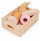 A wooden toy pretend microwave to heat up your dinner and hot chocolate! This set includes a cup with removable whipped cream, a plate and a Tupperware-style wooden box and lid that contains a sausage, baked beans and broccoli. Microwave oven has an opening door, and a clacking knob and two push buttons. A nice way of teaching children about not wasting food, and inspiring new skills in the kitchen.