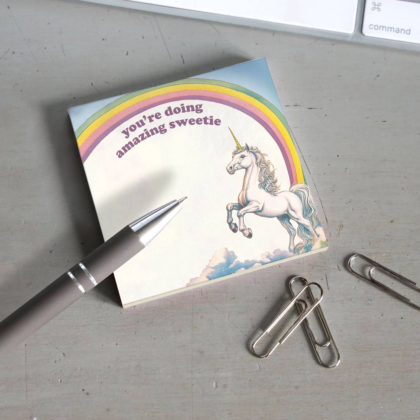 Get ready for some hilariously over-the-top motivation with our "You're Doing Amazing, Sweetie" sticky note! Featuring a vintage illustration of a rainbow and unicorn, this note takes positive reinforcement to a whole new level. • sized at 3"x3" • 50 pages