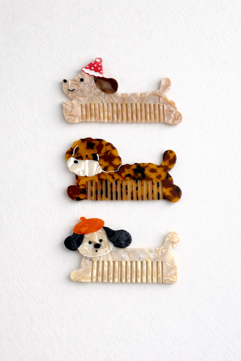 A playful dog-shaped hair comb crafted from glossy acetate, featuring charming details and a smooth, snag-free finish. Lightweight and durable, available in 3 styles.
