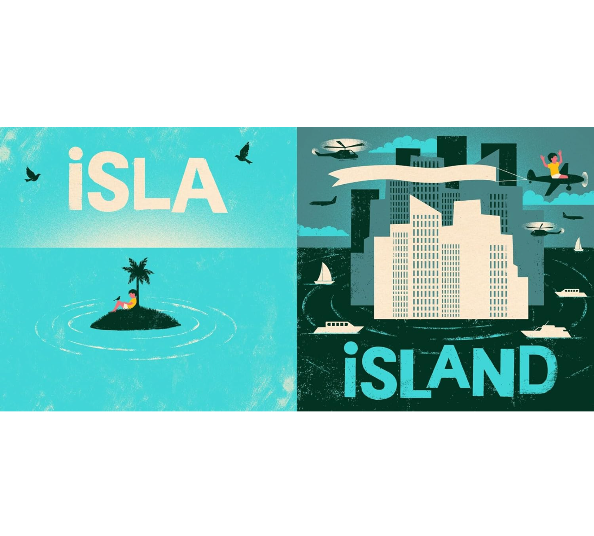 With every word presented in both Spanish and English, each illustration contrasts the cultural associations between the words, demonstrating the different types of plantas (plants), música (music), and even leche (milk) across cultures and experiences.