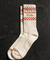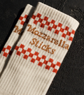 Features: 76% cotton 22% polyester 2% elastane Checkerboard striped half terry crew sock “mozzarella sticks" on both sides of sock Available in white color One size fits most adults (sizes 9-11) Machine wash