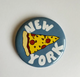 This greeting card features a New York City street scene. The front of the card showcases an illustrated of a row of buildings featuring the familiar street level businesses with apartments and fire escapes on top. Set against a sand colored background, the card reads "Greetings from New York" in white cursive handwriting scrawled across the bottom of one building.
