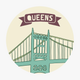 This vinyl sticker features an illustration of the hellgate bridge in the astoria neighborhood of queens. It features the bridge in red and cream along with a banner proclaiming "queens" in a rich shade of red against a pastel light coral background.