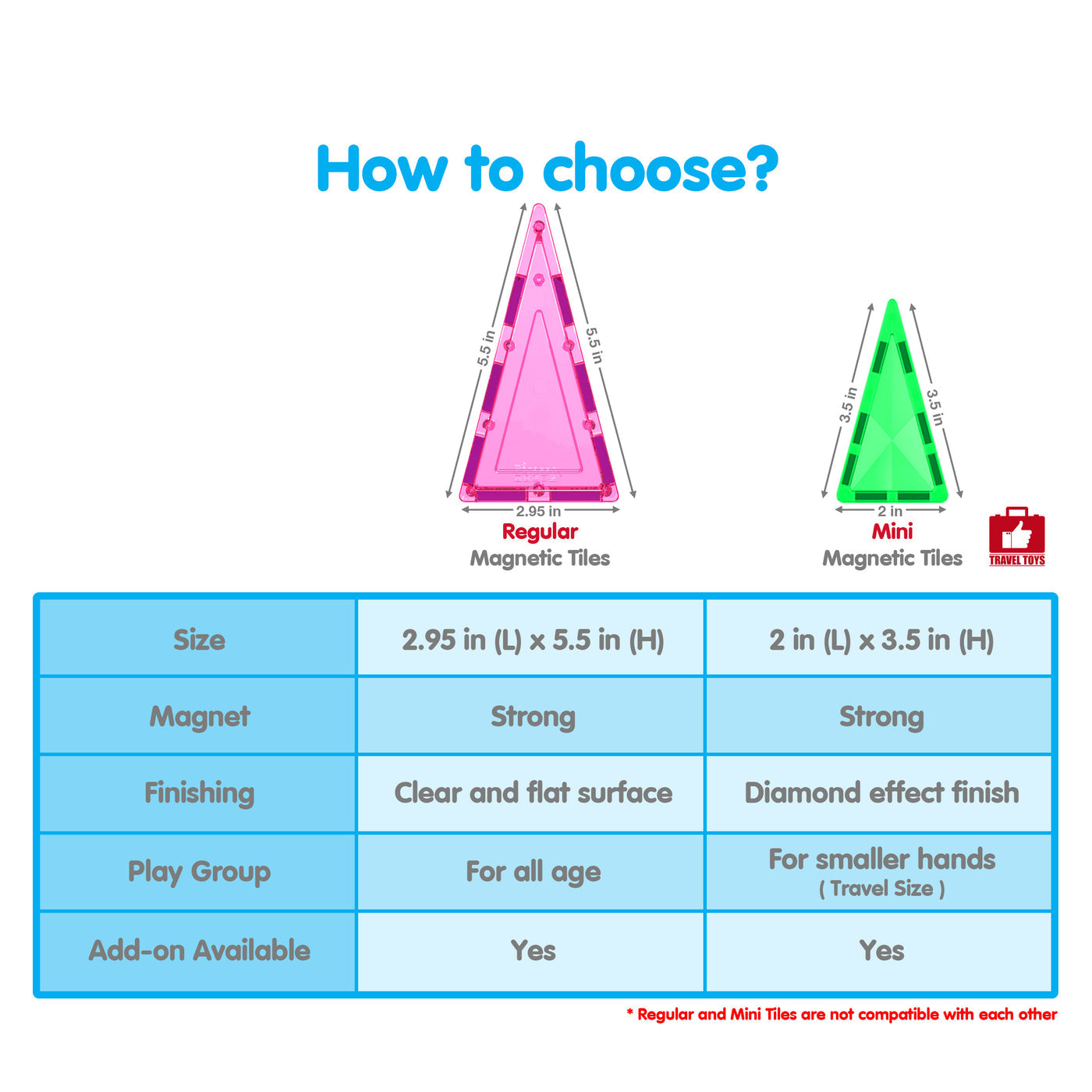 The magnetic building block playset MINI series features 60 pieces of TRAVEL-SIZE tiles with a unique diamond surface to be used as a stand-alone set or in conjunction with other PicassoTiles MINI magnet construction toys as integrated add-on pieces to offer.