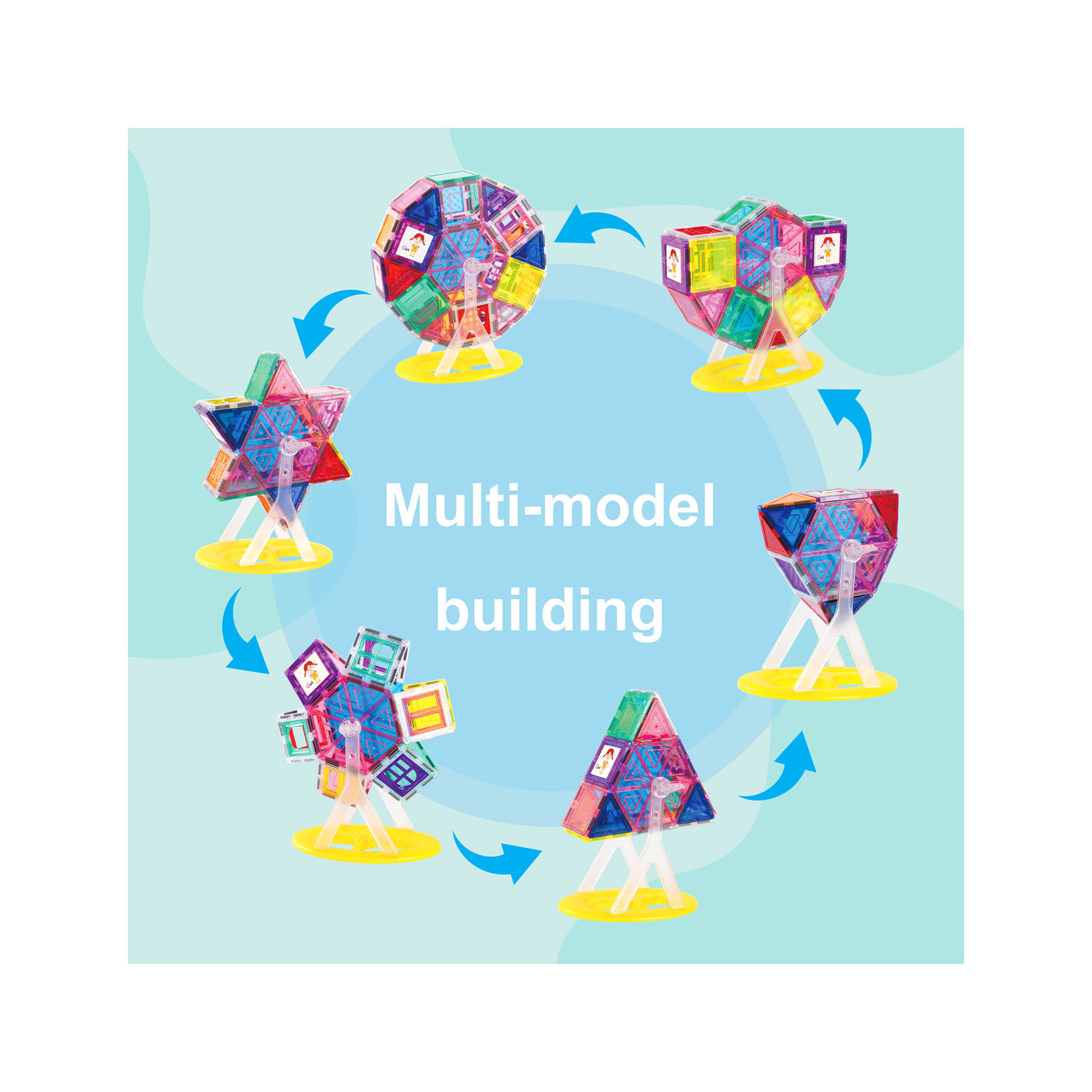 • 61 magnet tiles and accessories to build a Ferris Wheel structure
