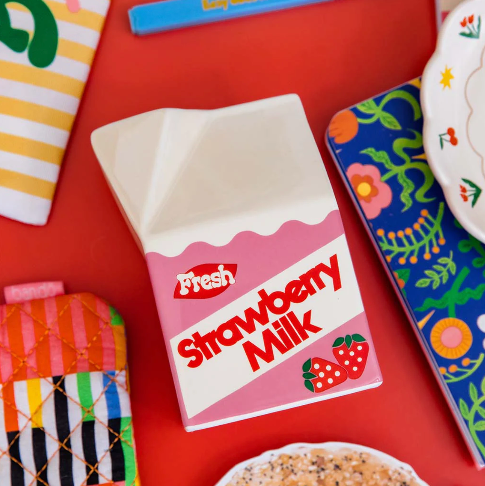 Gulp. It's not quite milk and it's not quite a strawberry - it's strawberry milk! Add some flowers or pens and pencils as you please.