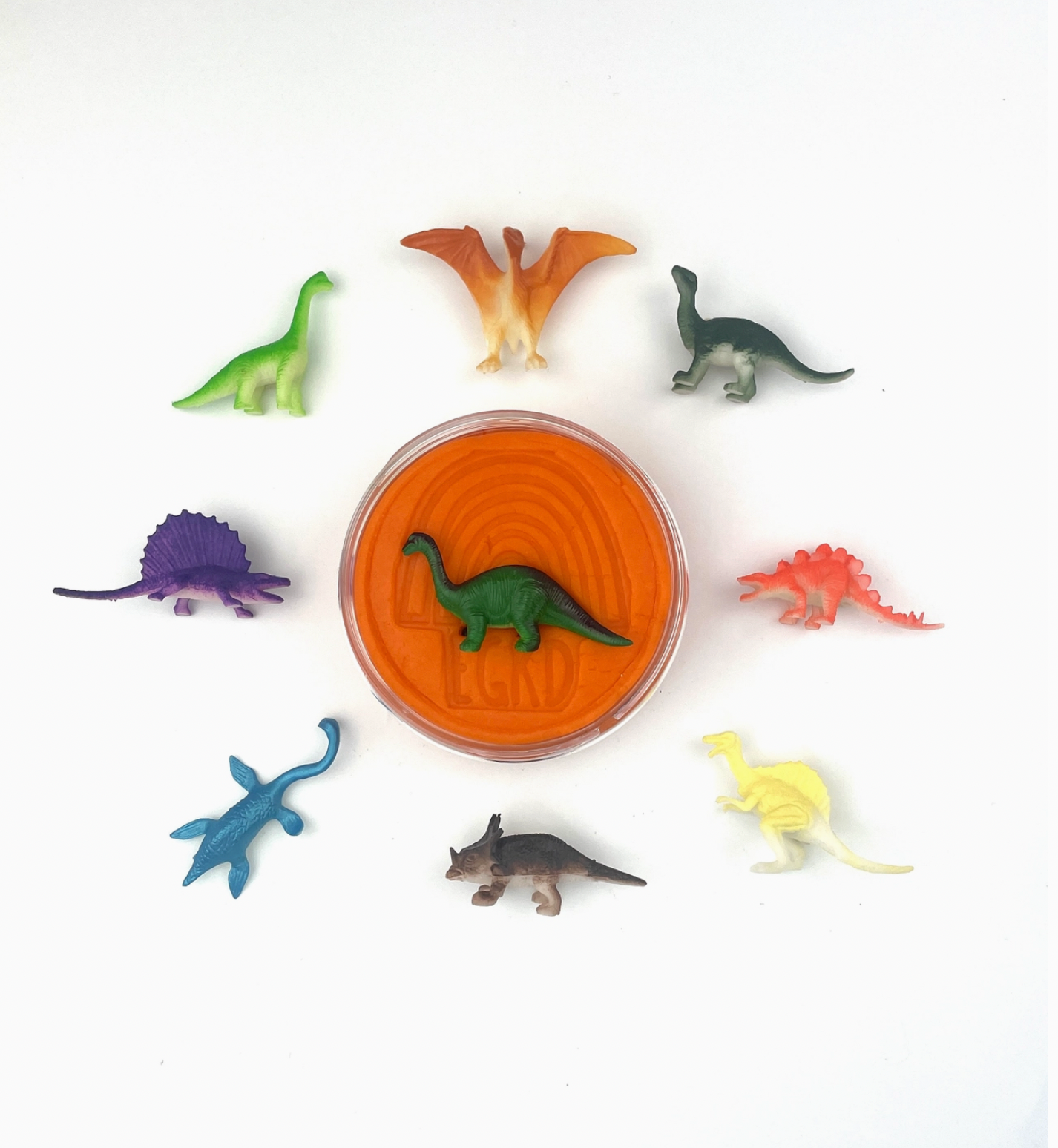 Includes: One Orange (Mango Tango) Half Pound KidDough with one of 12 different hidden dinosaur surprise figurine