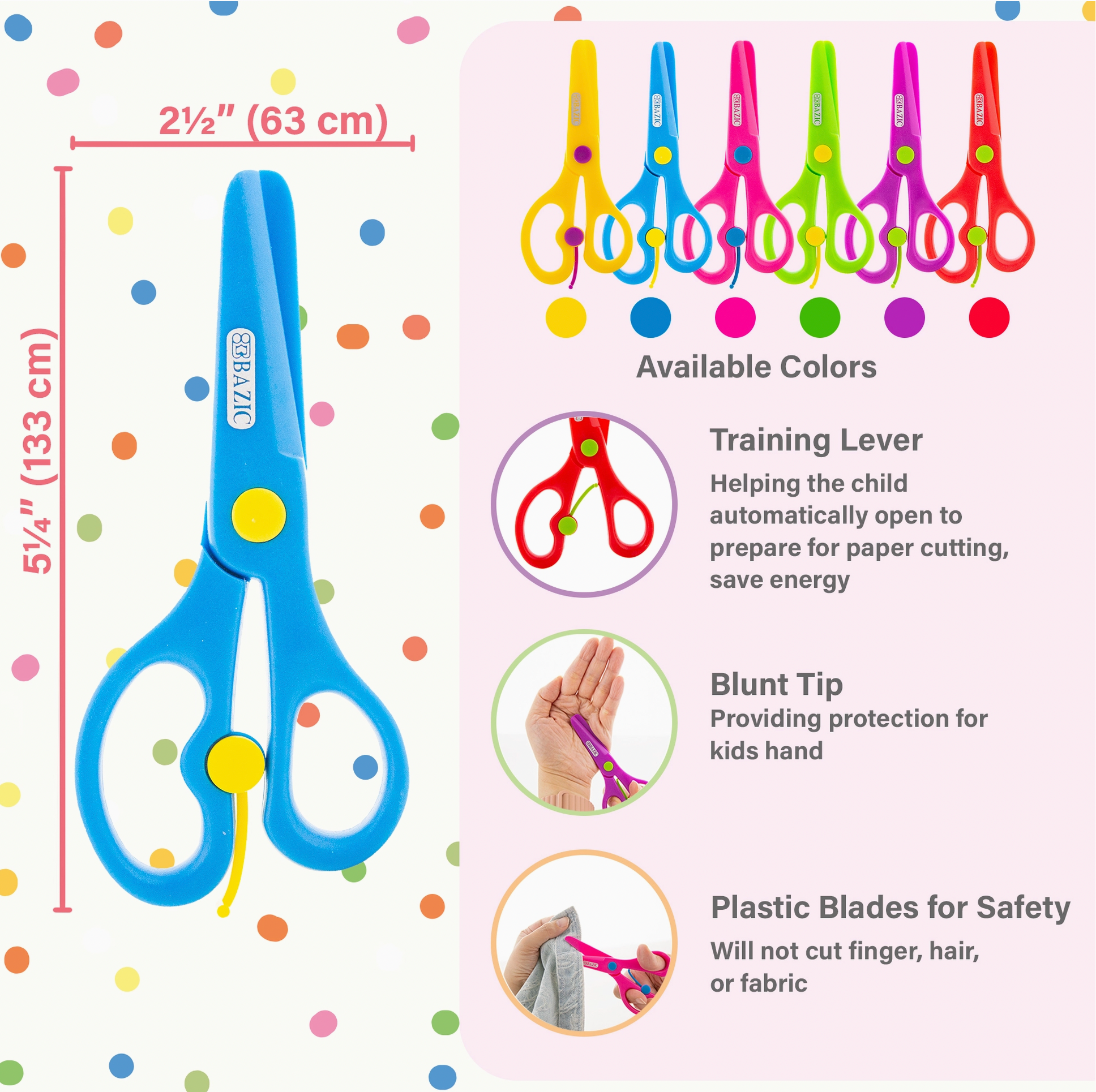 BLUNT BLADE. BAZIC safety scissors are designed for little hands with rounded tips and plastic blades to safely cut paper only - not hair, skin, or fingers. Item measure: 5.25" x 2.5". Available in 6 bright colors.