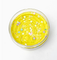 A half pound of Pastel Yellow “Peep” Marshmallow Chick Scented Sensory Dough with Chick Sprinkle clay fimo mix and ring of cracked egg clay fimos around the jar rim.