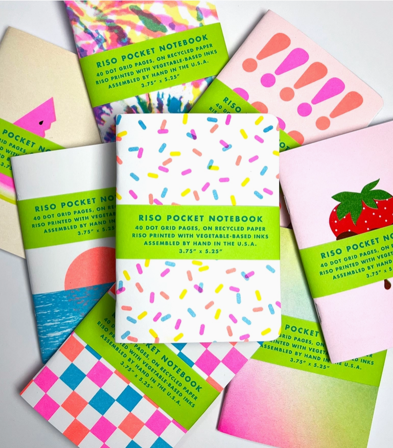 3.75” x 5.25” * 40 Pages * Dot Grid Interior Color wraps across front and back cover. Soft touch laminated cover. Rounded corners. Lime greed stitched binding.