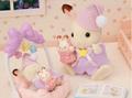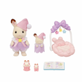 Bedtime is fun with this set that includes the Chocolate Rabbit girl and cradled baby with a baby gym and matching accessories.The adorable baby gym with a mobile will lull the cradled baby to sleep.The Chocolate Rabbit cradled baby has a special sleeping design with her eyes closed.The girl and cradled baby are wearing matching pajamas with night caps.The puppet can be placed on the girl's hand.