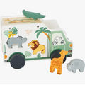 A shape-fitting game and a wooden toy car together as one! with this wooden shape-fitting game in a popular safari look, the giraffe, hippo, lion, and their friends are taking a trip into the wilderness while the friendly zebra drives the wooden vehicle. The safari bus has in total five insert holes in animal shapes on all sides through which the matching figurines can be inserted. This toy car is richly detailed and offers ample space for the cute wooden figurines. for long-lasting and diverse playtime fun in the nursery! It's a lovingly designed vehicle which playfully trains recognition of shapes and motor skills.