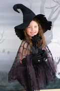 This enchanting ensemble features a black tutu skirt with layers of tulle and a spider web patterned overlay. The waistband is elastic, ensuring a comfortable fit for children of all sizes. The coordinating cape is made of mesh black fabric with spider web detailing and is held in place with a velcro fastener at the neck. Your child will love the spooky yet stylish design and the opportunity to become a witchy spider queen. Pair with our Mighty Witch Hat to complete the look!